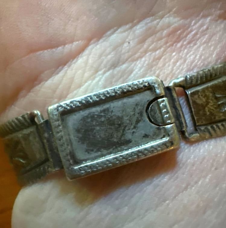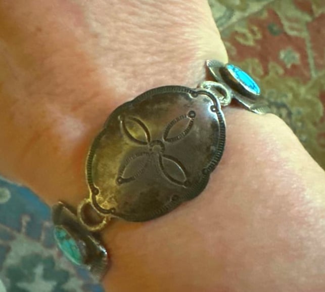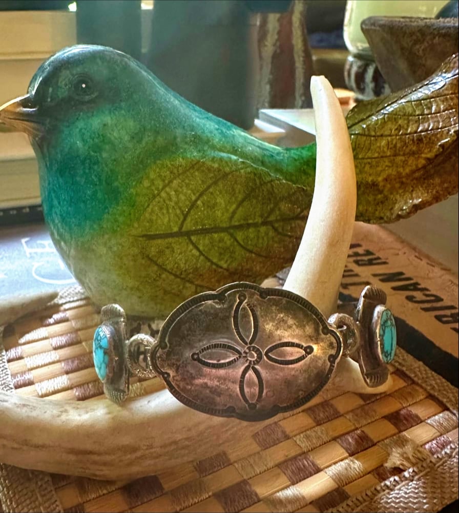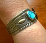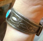 Another quite rare saved "piece" - made from a native hinged-watch bracelet with 2 natural turquoise cabochons and a vintage concho belt part- ( all parts have cool stamping) the belt part is clipped onto the bracelet- not soldered- saving two unusual cool vintage "bits" :) The turquoise is quite blue with darker matrix- the original cuff is vintage and unsigned but stamped sterling - OOAK from the "Time-Less" collection of Bits and Pieces