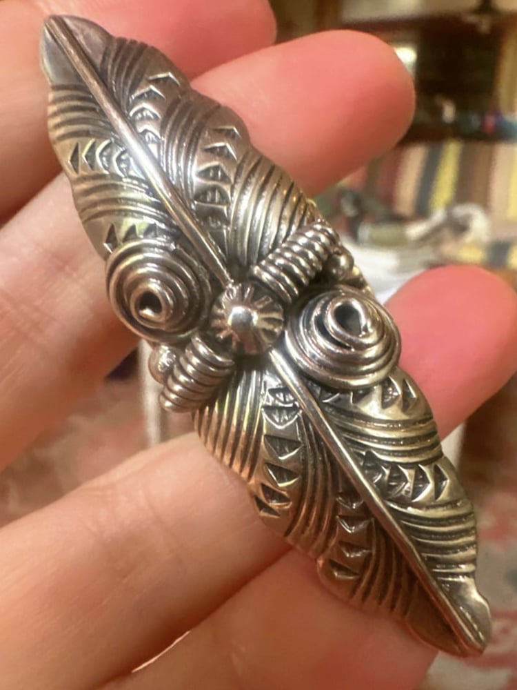 This striking Navajo-made ring by silversmith Limbert Perry is crafted from heavy gauge sterling silver, showcasing the artist’s skill in bold, traditional design. The elongated form is beautifully detailed with deeply stamped and hand-carved feather motifs, accented by coiled silver scrolls that add dimension and movement. Each line and cut reflects meticulous craftsmanship, creating a strong yet graceful presence. Substantial in weight and size, the ring embodies both strength and artistry, making it a true statement piece. With its intricate textures and timeless Navajo symbolism, this ring carries the spirit of tradition while offering a distinctive style that is both wearable and collectible.