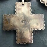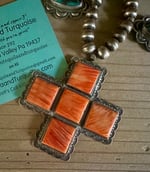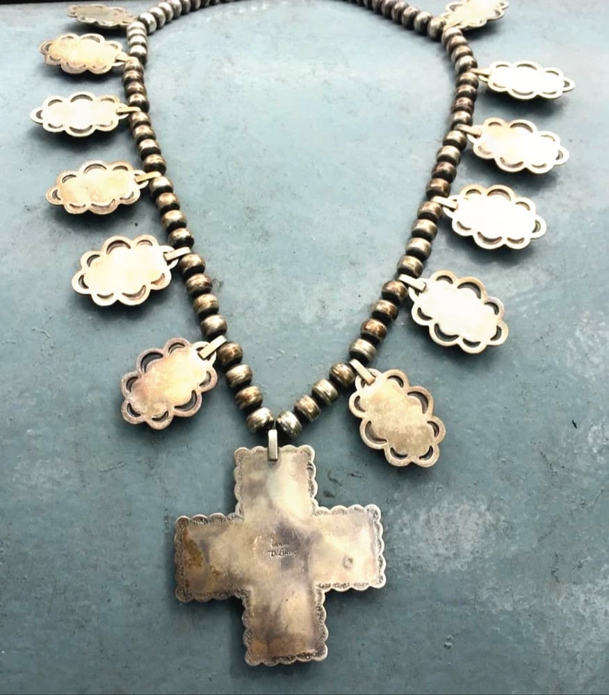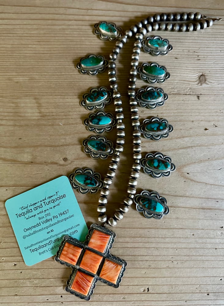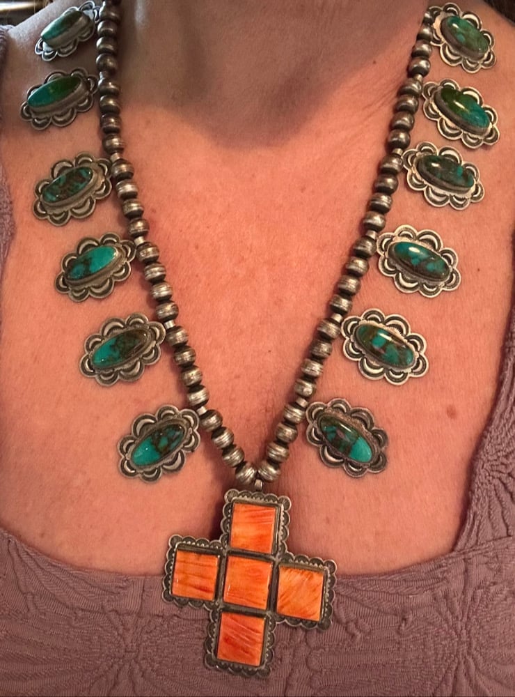 This collectible Don Lucas necklace is a striking blend of tradition and artistry. Handcrafted over 25 years ago and acquired from its original owner, it carries the timeless beauty of a piece lovingly preserved. The necklace features vibrant turquoise cabochons set in scalloped sterling silver stations, joined by classic Navajo pearls. At its heart hangs a bold cross pendant inlaid with fiery orange spiny oyster, creating a captivating contrast of color and texture. Known for his distinctive designs and exceptional craftsmanship, Don Lucas pieces are sought after worldwide, making this necklace not only a stunning adornment but also a valuable collector’s treasure. A rare opportunity to own a vintage creation from a renowned artist, ready to become a highlight in any collection.