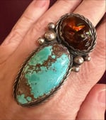 This vintage ring features an oval turquoise main stone with a fire agate secondary stone that has a vibe of amber and opal making a stone baby. The stones are set in sterling with such terrific balance for a heavy ring! The ring is signed, with a full finger style and large raindrops on each side. It has a bohemian vibe, which is my jam- It can be sized down only for additional charge- just add that service and size needs to your cart:)