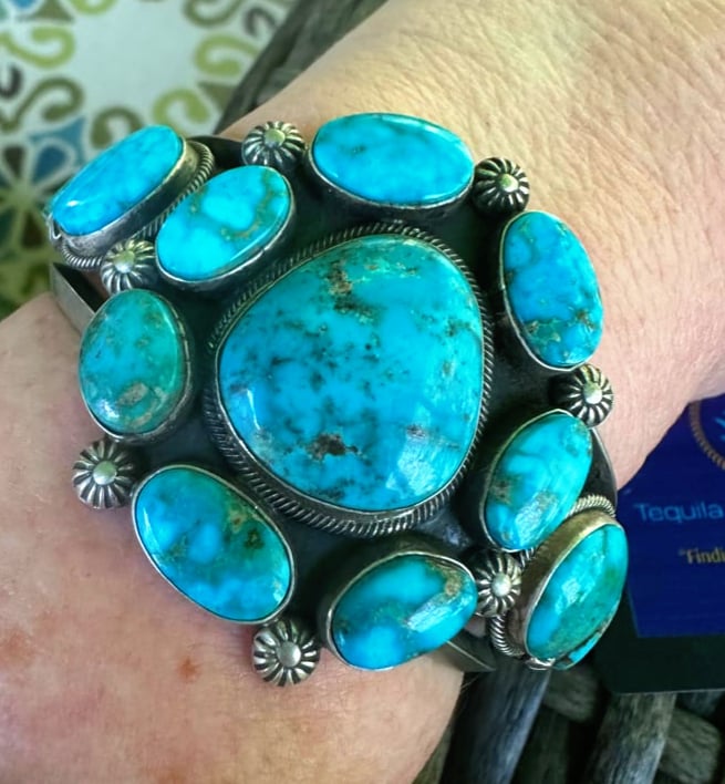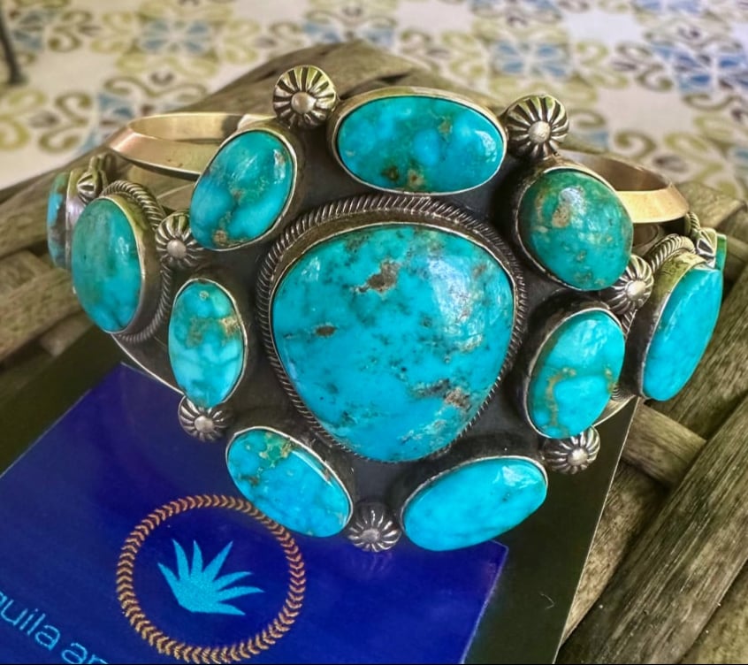 Bold, beautiful, and full of spirit—this cluster cuff by acclaimed Native artist Freddie Maloney is a true statement piece. Handcrafted from heavy-gauge sterling silver, it showcases a breathtaking arrangement of natural turquoise stones, each unique in its matrix and hue. The centerpiece is a large, natural-shaped turquoise gem, framed by 11 more vibrant ovals and accented with classic silver rosettes. The craftsmanship is exceptional, with a sturdy weight that feels as enduring as the land the stones come from. Maloney’s work is known for its timeless strength and balance, and this cuff is no exception—rich in tradition yet effortlessly wearable today. Whether layered with other silver favorites or worn as a solo showstopper, this collectible cuff will be treasured for generations.