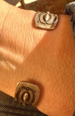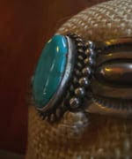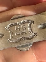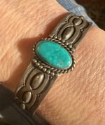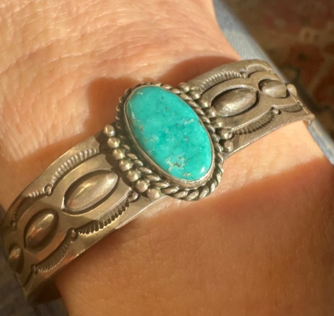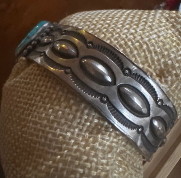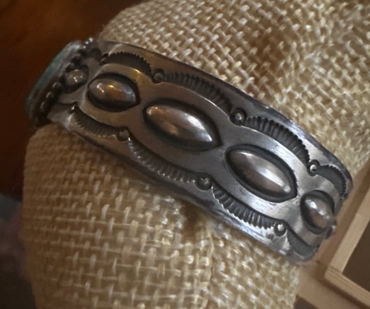 This Herman Smith -made cuff showcases a striking Whitewater turquoise smooth, bold, and full of natural character—set in a hand-cut bezel with classic bead accents. Beautifully stamped with repeating oval and swag designs, giving the piece strength and symmetry while drawing the eye straight to the stone. The silver has aged into a warm, well-loved patina that highlights every handmade detail. A standout cuff with soulful presence, perfect on its own or layered into a collector’s stack.