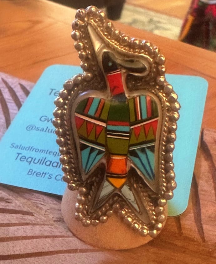 Story: From an unknown artist’s workbench in the Southwest, this Peyote Bird was born of patience, silver, and a rainbow of hand-cut stones—turquoise, coral, jet, and shell. Each piece was carefully shaped and fitted, like puzzle pieces holding a story of protection and power. With its bold wings and bright colors, it carries the spirit of flight, strength, and joy. Once polished to perfection, it made its way through trading hands, admired for its beauty, until landing in our collection. Now, it’s ready to spread its wings once more—bringing color, tradition, and a spark of waterbird magic to its next keeper.