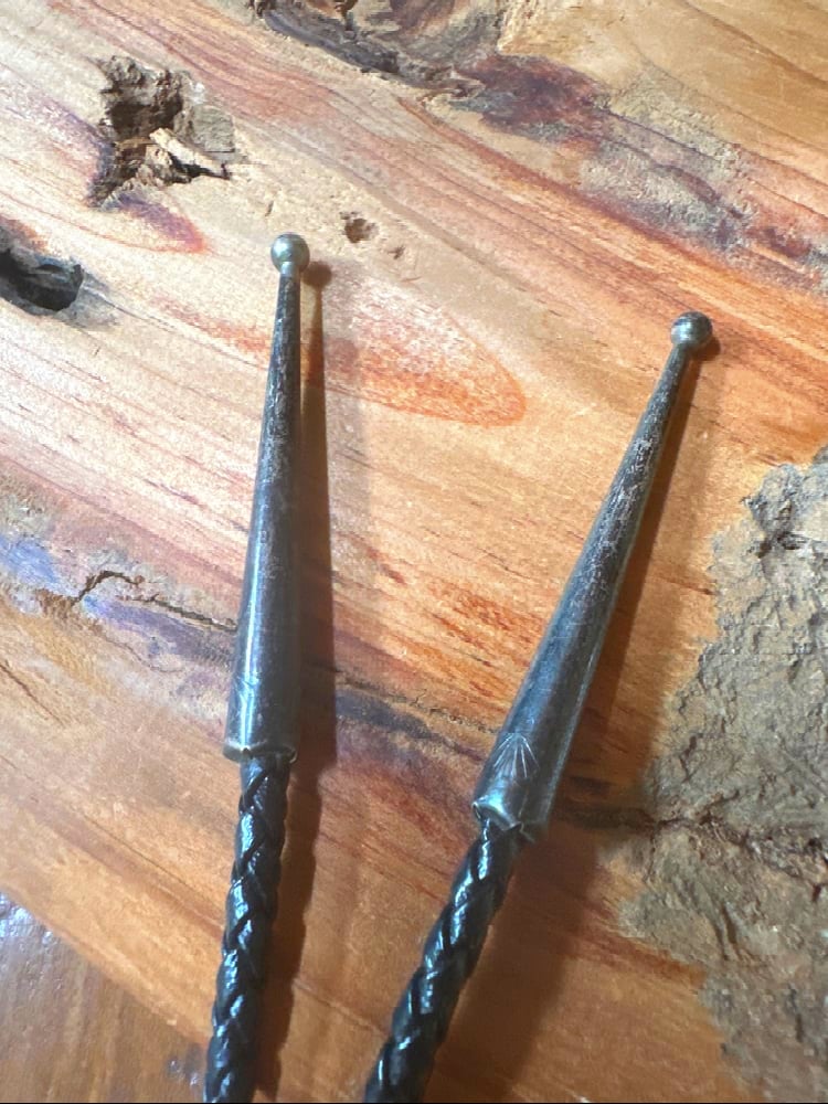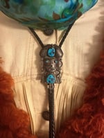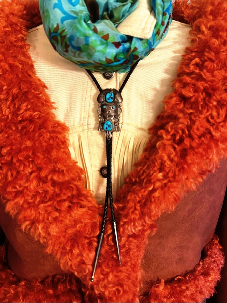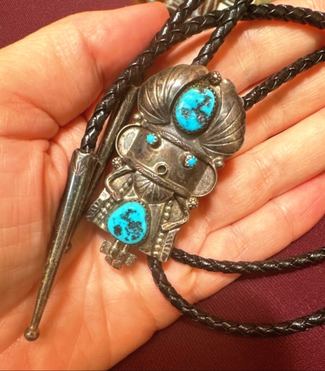 Description:Meet this whimsical vintage kachina bolo, a spirited traveler with turquoise eyes that have watched many hands and hearts before yours. Forged in silver and set with striking stones, he once danced through trading posts, shared stories across campfires, and even rested in a collector’s trunk before finding freedom again. Each stop along his journey added a layer of history and charm to his already playful character. Now, after wandering far and wide, he has landed in my store—ready to carry his tales forward and bring a spark of mischief, tradition, and timeless artistry to his next keeper. A true road-worn spirit with plenty of adventure left to share.