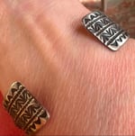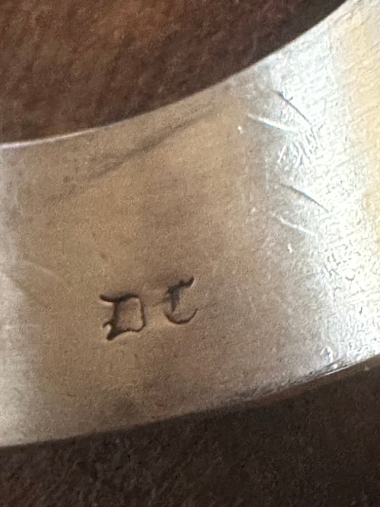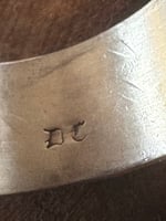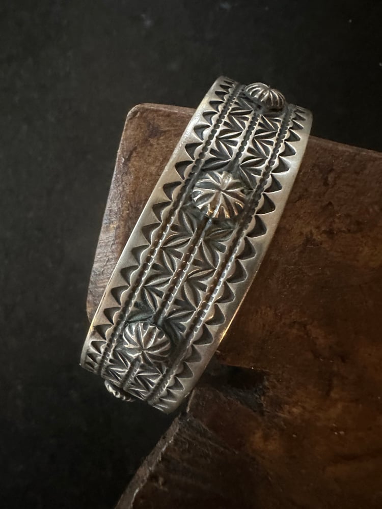 This signed Native-made stacker cuff brings classic stamp work to life with bold presence. Deep, symmetrical hand-stamped patterns run the length of the band, anchored by three raised repousséd domes that give it strength and dimension. Darkened recesses highlight every line, while the clean edges keep it refined enough for daily wear. A beautifully crafted vintage piece with timeless character—perfect alone or layered into your favorite stack.
