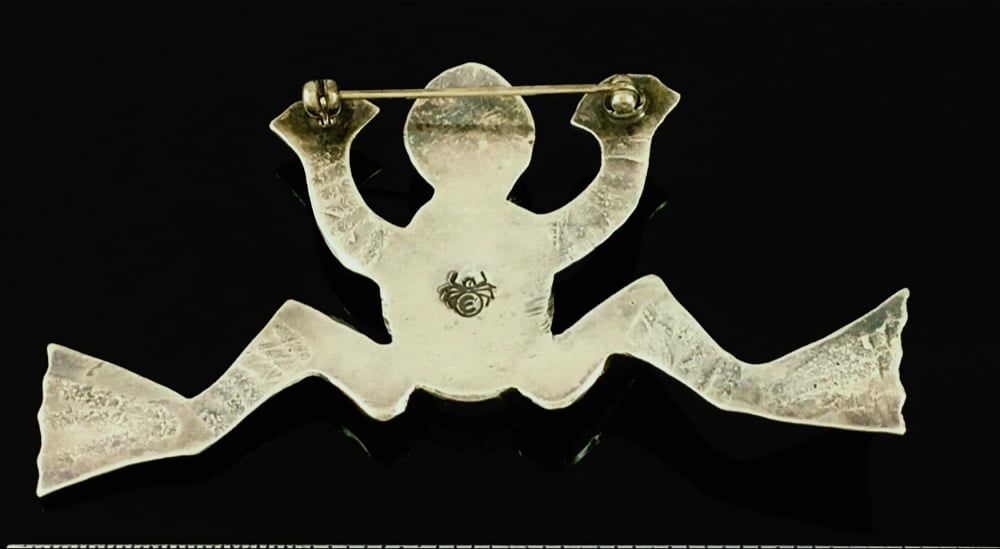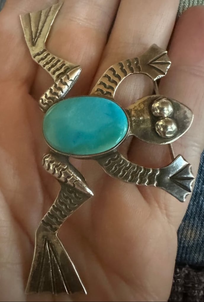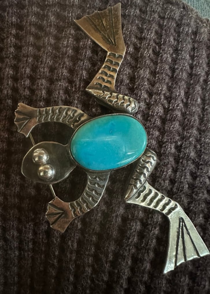 Meet Sir Hops-a-Lot, a turquoise-hearted traveler who’s leapt through decades collecting sunshine, raindrops, and stories. Crafted by Joe Eby, an American artisan taught by Native masters, this sterling silver and turquoise frog pin carries both playfulness and deep tradition. His shimmering turquoise belly mirrors desert skies, while every etched limb tells of rivers crossed and laughter shared along the way. Whether he’s perched on a lapel or hopping into a collection, Sir Hops-a-Lot brings good fortune, joy, and a reminder that every journey—no matter how small—is worth the leap.