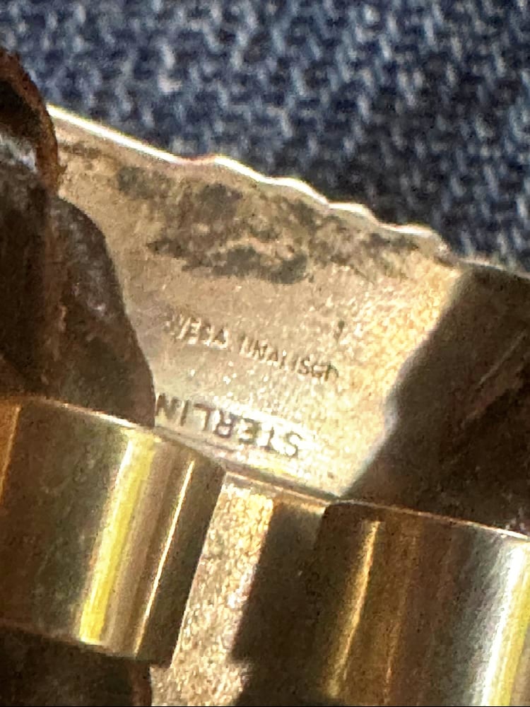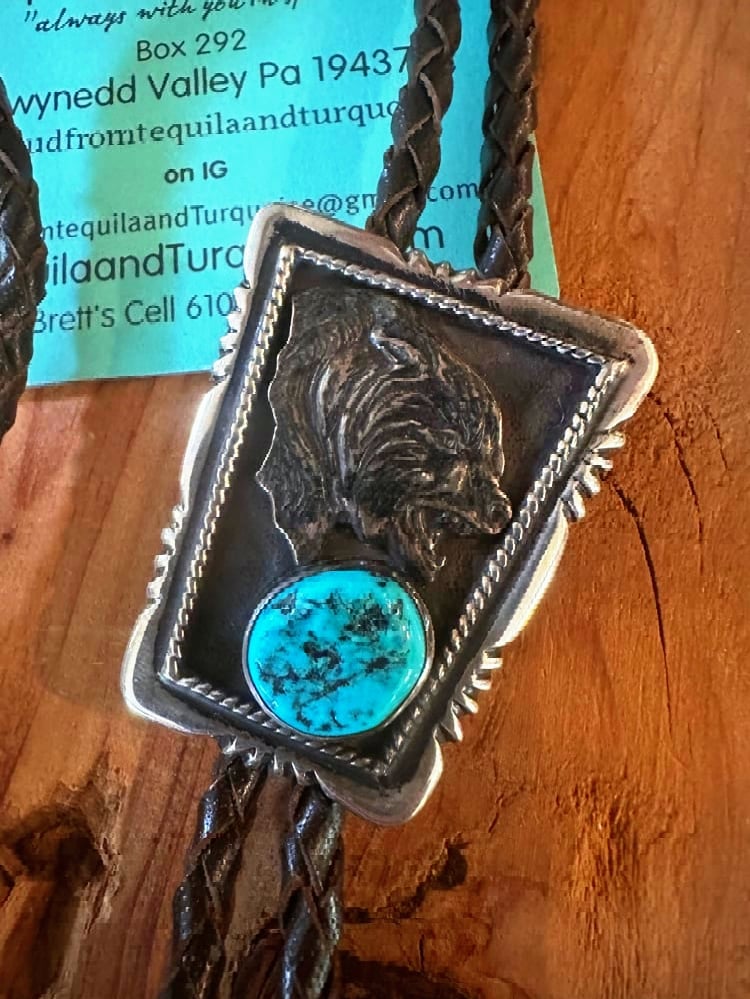 This remarkable bolo tie, signed by a Cherokee artist, Wesa Unalisgi, carries the quiet power of its namesake — the bear. Handcrafted in sterling silver with deep textural detail and a striking turquoise stone, it reflects both strength and grounded spirit. The heavy, braided leather cord ends in substantial sterling tips, each set with turquoise, balancing rustic energy with fine craftsmanship. Rarely found and steeped in heritage, this piece traveled from its maker’s bench into our collection with the sense of purpose and endurance that defines true Native artistry. A collectible bolo with story and presence — the kind that wears like history, not just adornment.